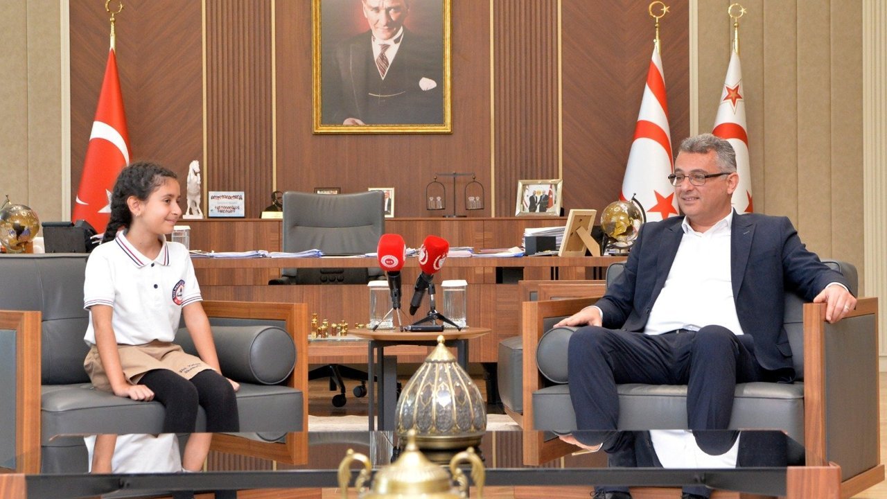 Kabulde konuşan Cumhurbaşkanı Erhürman, öğrencilerle bir araya gelmekten duyduğu memnuniyeti ifade ederek tüm çocukların bayramını kutladı. Ziyaret sırasında Erhürman, koltuğunu Şht. Yalçın İlkokulu 5’inci sınıf öğrencisi Masal Şevki’ye devretti.