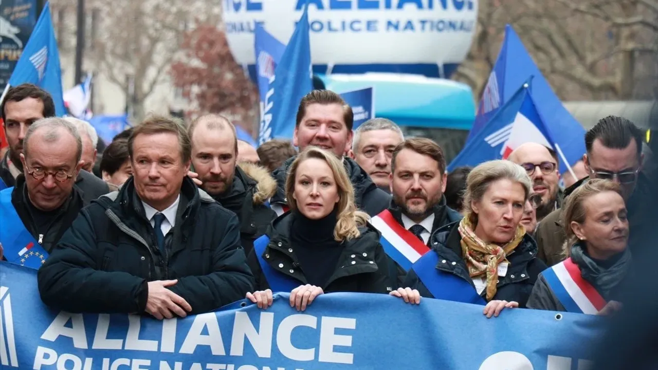 Fransa ve sendika bayrakları taşıyan polisler, mesai saatleri, personel yetersizliği, maaşlar ve güvenlik riskleri gibi konulardaki sorunlara dikkat çekti.