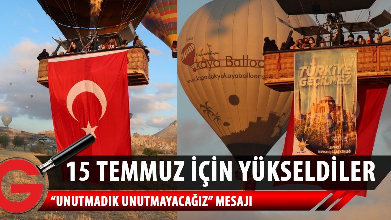 AK Parti Nevşehir İl Başkanlığı tarafından 15 Temmuz Demokrasi ve Milli Birlik Günü dolayısıyla sıcak hava balon sepetlerine Türk Bayrakları ve Türkiye geçilmez, unutmadık unutturmayacağı pankartları asıldı. Programda açıklama yapan AK Parti İl Başkanı Ali Kemikkıran, Kapadokya bölgemizde sıcak hava balonları bu anlamlı günde Türk bayrakları ve 15 Temmuz anısına hazırladığımız pankartlar ile havalandı dedi. Kemikkıran, “15 Temmuz Demokrasi ve Milli Birlik Günü’nde bu anlamlı günde dünyanın incisi Kapadokya bölgemizin en önemli araçlarından bir tanesi olan sıcak hava balonları bugün hem şanlı Ay Yıldızlı Türk Bayrağımız hem de sloganlarımız ile havalanıyor. Tabii unutmadık unutturmayacağız.