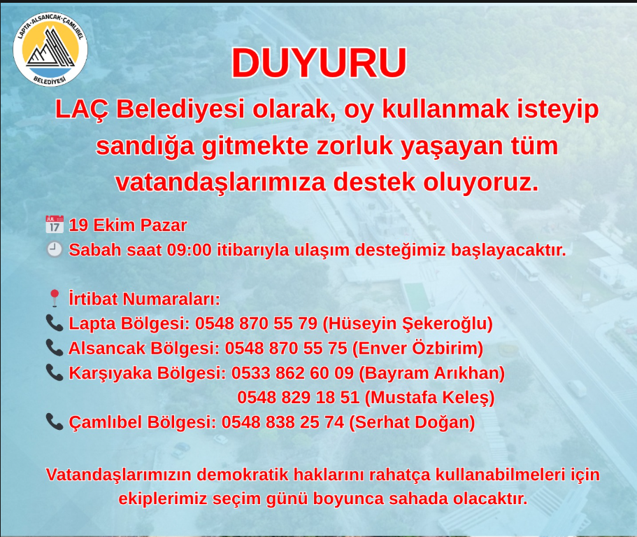 Yapılan açıklamada, sadece engelli bireylerin değil, ulaşım sorunu yaşayan tüm vatandaşların sandıklara ulaştırılacağı belirtildi. LAÇ Belediyesi, “Vatandaşlarımızın demokratik haklarını rahatça kullanabilmeleri için ekiplerimiz seçim günü boyunca sahada olacaktır” ifadelerini kullandı.