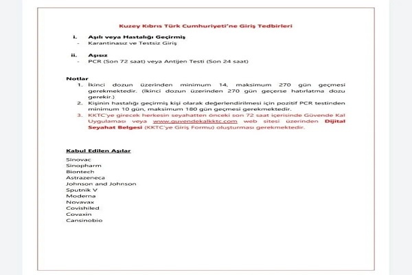 Ülkeye girişte kabul edilecek aşılar ise şöyle sıralandı: Sinovac, Sinopharm (Verocell), Comirnaty (Pfizer/Biontech), Vaxzevria (Astrazeneca/Oxford),Covid-19 Vaccine Janssen/Johnson and Johnson, Sputnik V, Moderna, Novavax, Covishield (Astrazeneca/Oxford), Covaxin, Cansinobio.